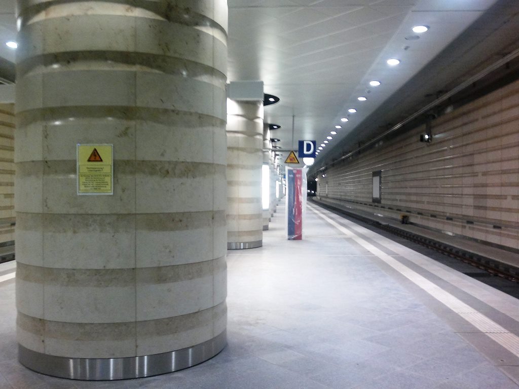 Interessant fand ich einen Umstand, den man nur bei Kenntnis der Vorgeschichte zur Entstehung der Station und genauerem hinsehen feststellen dürfte: Die Säulem in der "Mitte" des Bahnsteiges, also zwischen Gleis 1 (Tief) und Gleis 2 (Tief) des Hauptbahnhofes Leipzig stehen nicht in einer "geraden Flucht", sondern sind untereinander ein wenig versetzt. Dies kann man auch bei genauem hinsehen auf den Bildern weiter unten erkennen. Aber warum dies so ist - dazu muss man halt die Entstehung kennen. Vor vielen Jahren (wann genau, weiß ich auch nicht) wurde der Bahnhof einmal auf Grund von Bodenabsenkungen saniert und mit Betonstützen unterbaut. Diese Stützen wurden von der Oberfläche "einfach so" in den Untergrund getrieben. Hierbei kam es natürlich nicht darauf an, das die Säulen unter der Erde in einer Reihe fluchten. Vielmehr hatte man seinerzeit sogar "vergessen", diese Arbeiten in den Unterlagen zum Bahnhof zu vermerken. Als man nun den Einschnitt für den Tiefbahnhof in Tagebauweise aushob, traf man dort auf Hindernisse (= Stützen), mit denen man nicht gerechnet hatte. Aus der Not eine Tugend machend, wurden diese Betonsäulen, welche für die Gesamtstatik des Bahnhofes wohl weiter erforderlich sind, nun im Bereich des Bahnsteiges "hübsch" verkleidet. Nur stehen sie halt nicht "typisch deutsch" in einer sauberen Reihe...